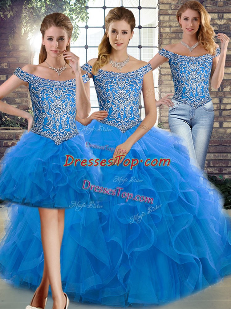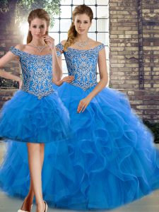 Blue Off The Shoulder Lace Up Beading and Ruffles Sweet 16 Quinceanera Dress Brush Train Sleeveless