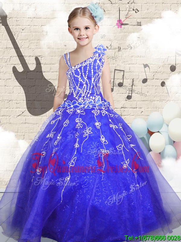 Blue Organza Lace Up Asymmetric Sleeveless Floor Length Little Girls Pageant Dress Wholesale Beading and Appliques and Hand Made Flower