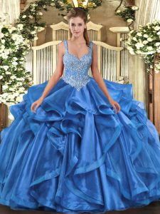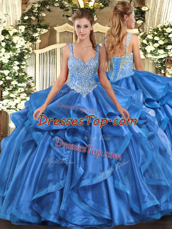 Blue Organza Lace Up Straps Sleeveless Floor Length 15th Birthday Dress Beading and Ruffles