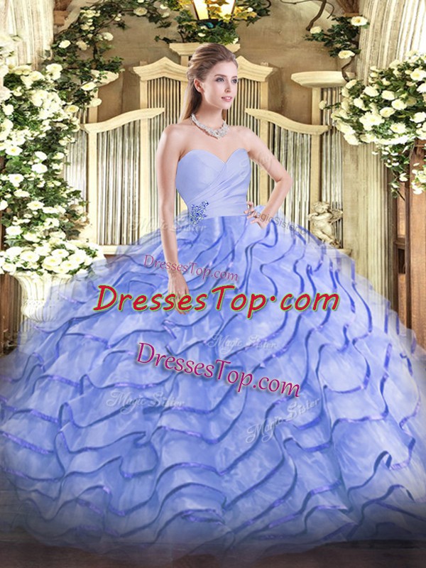 Blue Organza Lace Up Sweetheart Sleeveless Quinceanera Dresses Brush Train Beading and Ruffled Layers