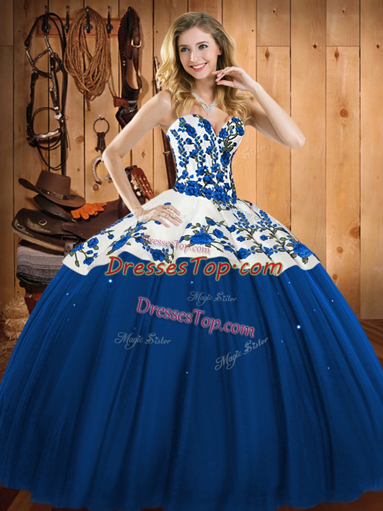 Blue Satin and Tulle Lace Up Quinceanera Dress Sleeveless Floor Length Embroidery
