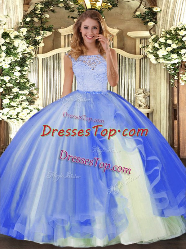 Blue Scoop Clasp Handle Lace and Ruffles Quinceanera Gowns Sleeveless