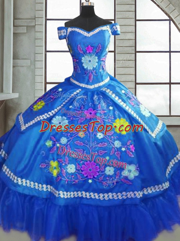 Blue Short Sleeves Taffeta Lace Up Quinceanera Gowns for Military Ball and Sweet 16 and Quinceanera