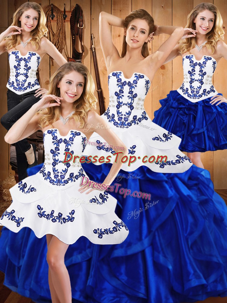 Blue Strapless Lace Up Embroidery and Ruffles Quince Ball Gowns Sleeveless