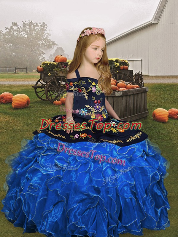 Blue Straps Lace Up Embroidery and Ruffles Little Girls Pageant Dress Sleeveless