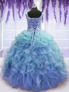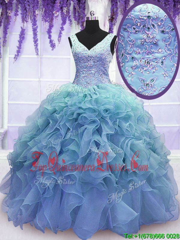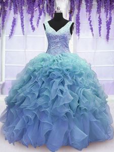 Blue Sweet 16 Dresses Military Ball and Sweet 16 and Quinceanera and For with Beading and Embroidery and Ruffles V-neck Sleeveless Lace Up