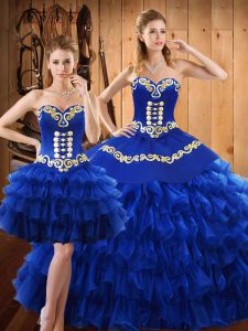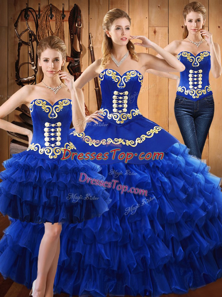 Blue Sweetheart Neckline Embroidery and Ruffled Layers Quince Ball Gowns Sleeveless Lace Up
