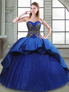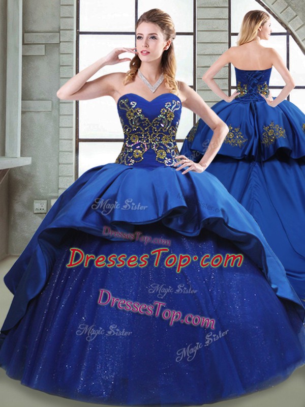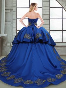 Blue Taffeta Lace Up Quinceanera Gown Sleeveless Court Train Beading and Appliques and Embroidery
