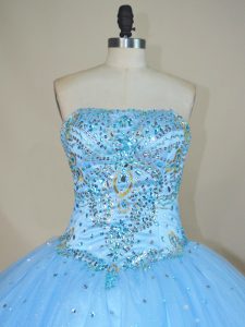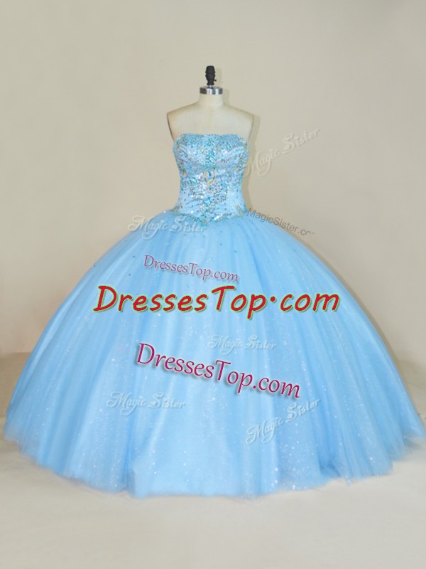 Blue Tulle Lace Up Ball Gown Prom Dress Sleeveless Floor Length Beading