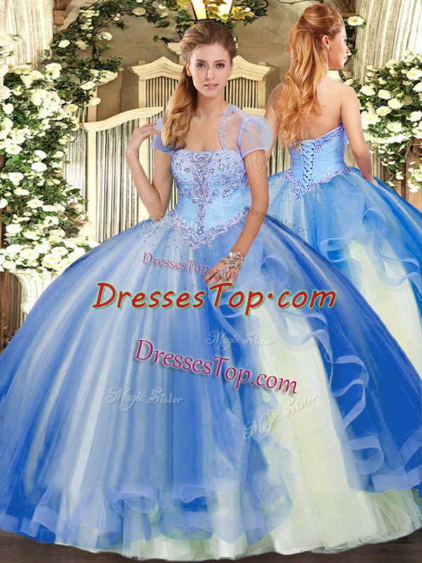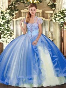 Blue Tulle Lace Up Sweet 16 Dress Sleeveless Floor Length Appliques and Ruffles