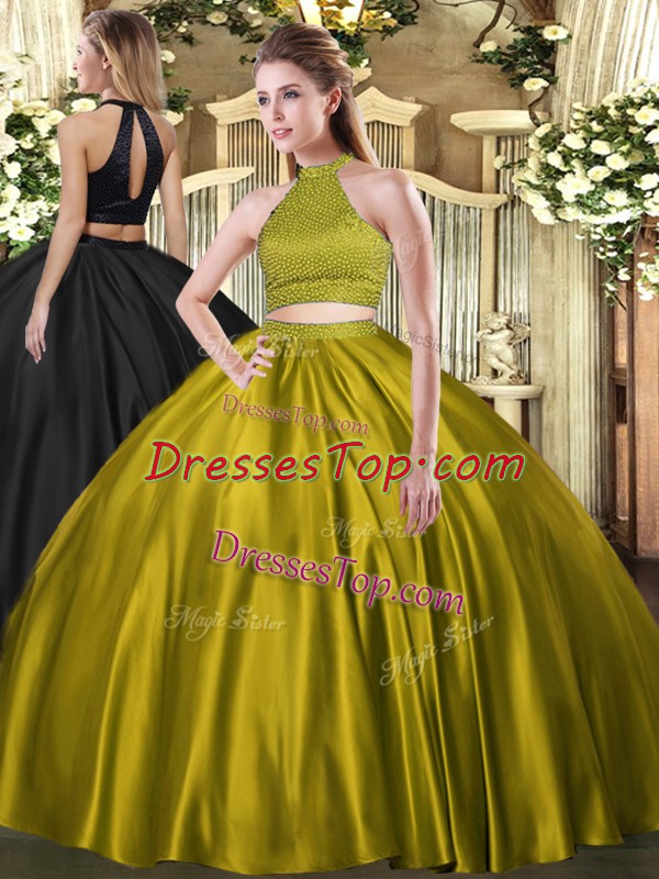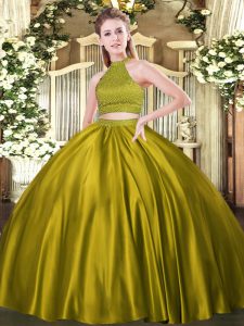 Brown Ball Gowns Tulle Halter Top Sleeveless Beading Floor Length Backless Ball Gown Prom Dress