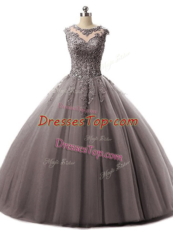 Brown Ball Gowns Tulle Scoop Sleeveless Beading and Lace Floor Length Lace Up Quince Ball Gowns