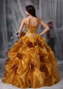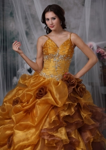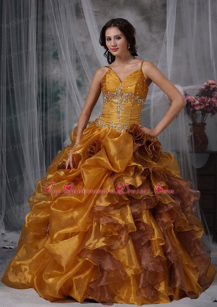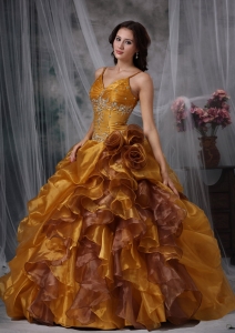 Brown Flowers Spaghetti Straps Beading Quinceanera Ball Gown