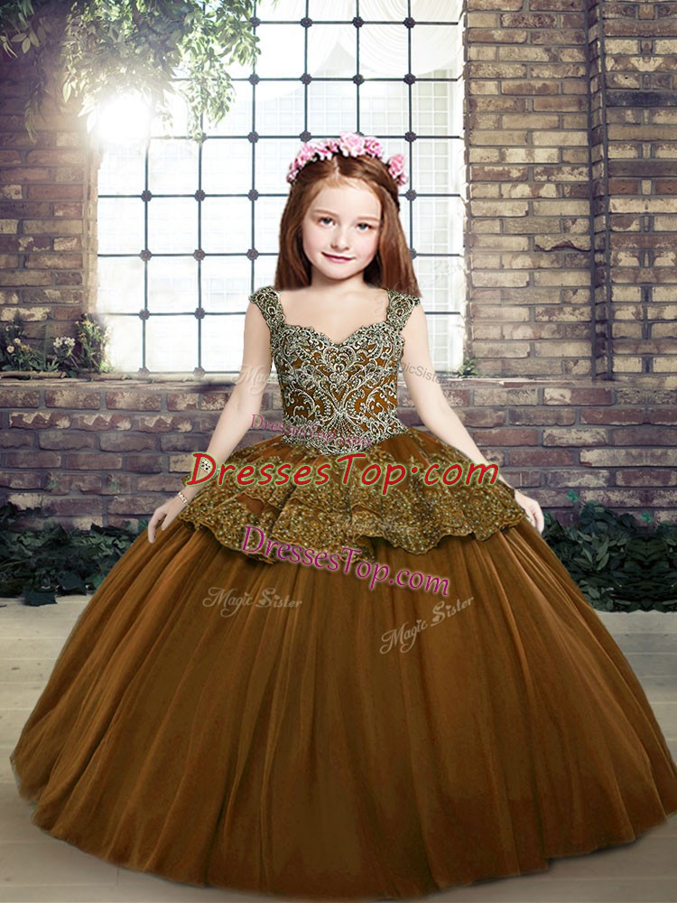 Brown Lace Up Pageant Dress for Girls Beading and Appliques Sleeveless Floor Length