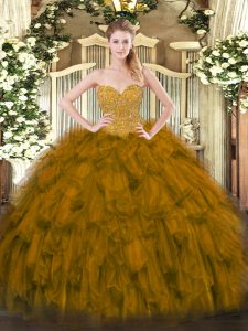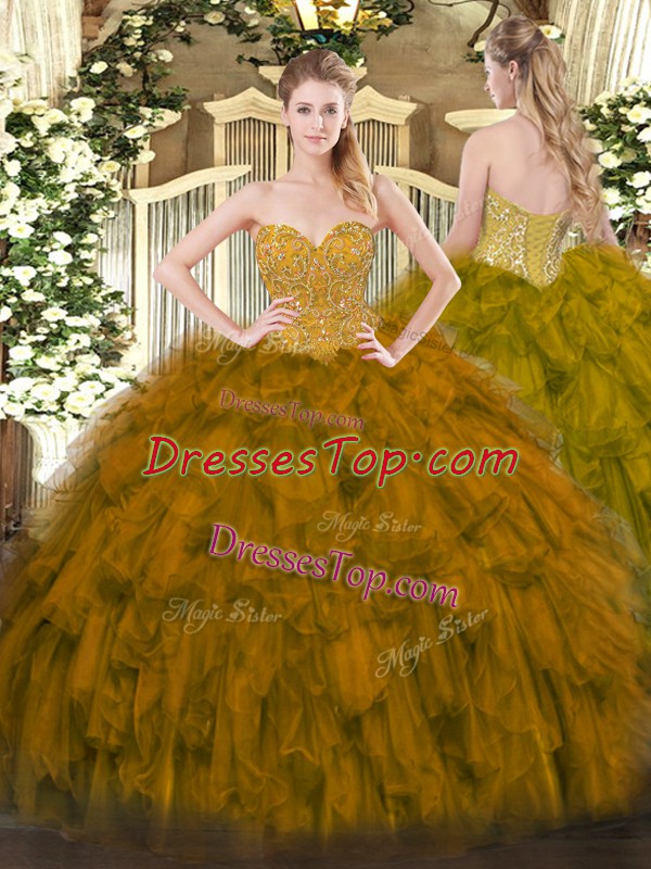 Brown Organza Lace Up Ball Gown Prom Dress Sleeveless Floor Length Beading and Ruffles