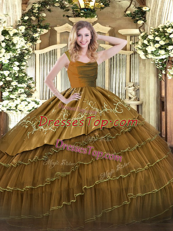 Brown Sleeveless Satin and Organza Zipper Sweet 16 Quinceanera Dress for Military Ball and Sweet 16 and Quinceanera