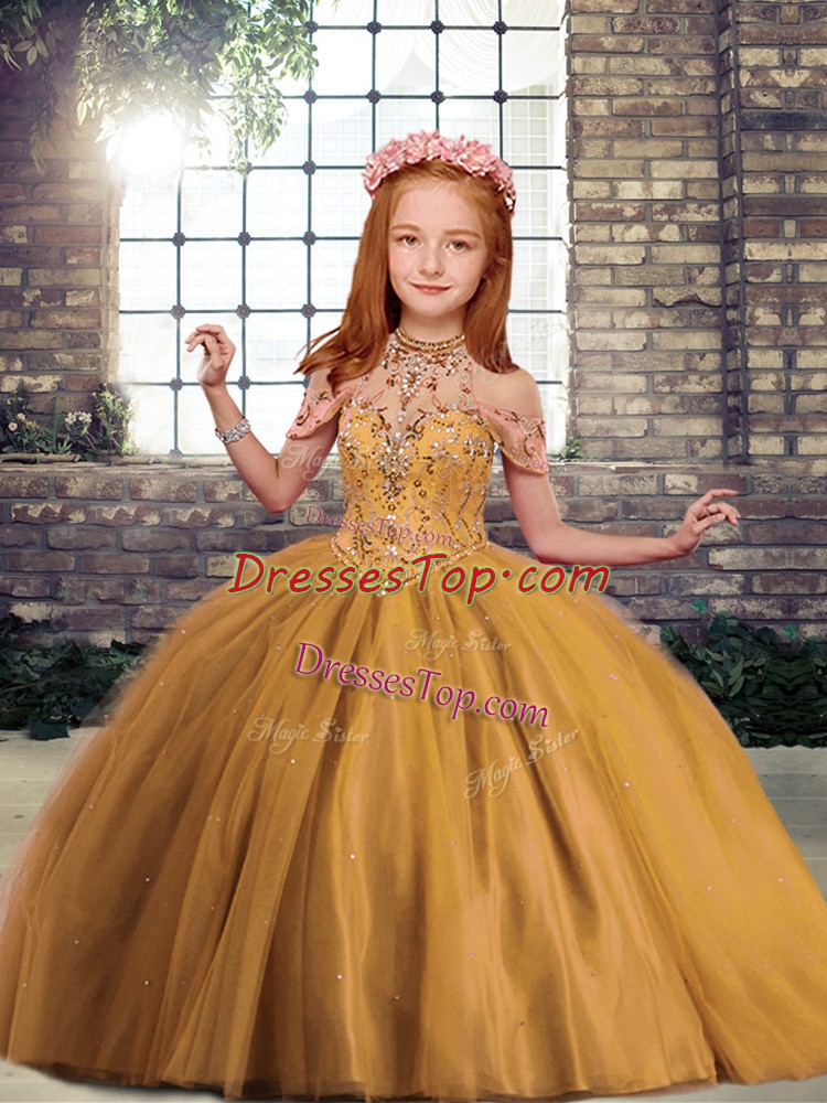 Brown Tulle Lace Up High-neck Sleeveless Floor Length Little Girl Pageant Gowns Beading
