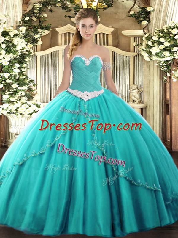 Brush Train Ball Gowns 15 Quinceanera Dress Turquoise Sweetheart Tulle Sleeveless Lace Up