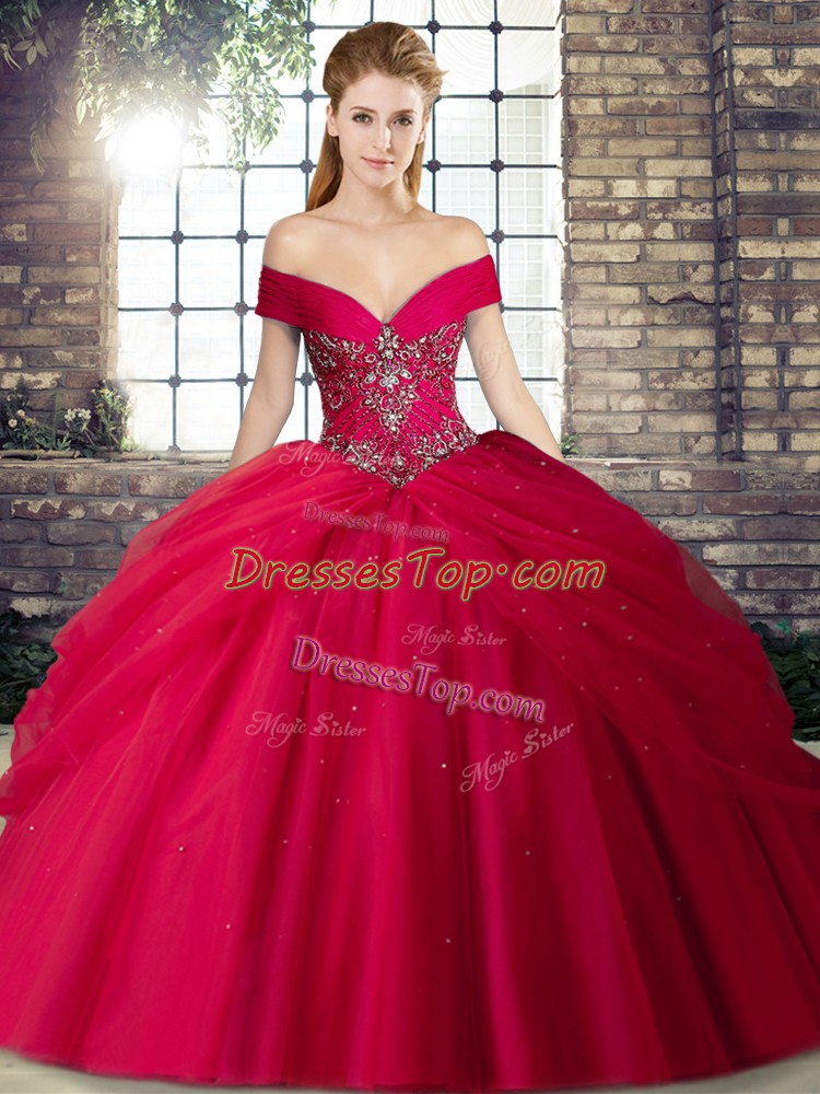 Brush Train Ball Gowns Vestidos de Quinceanera Red Off The Shoulder Tulle Sleeveless Lace Up