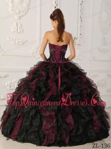 Burgundy and Black Ball Gown Strapless Floor-length Taffeta and Organza Beading Quinceanera Dress