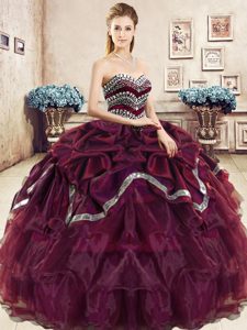 Burgundy and Purple Ball Gowns Sweetheart Sleeveless Organza Floor Length Lace Up Beading and Ruffled Layers and Pick Ups 15th Birthday Dress