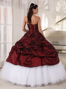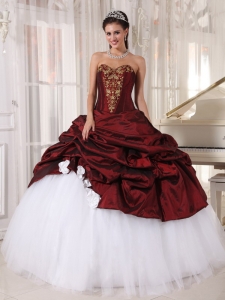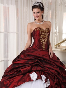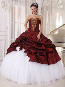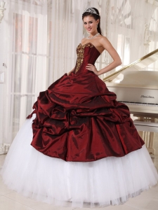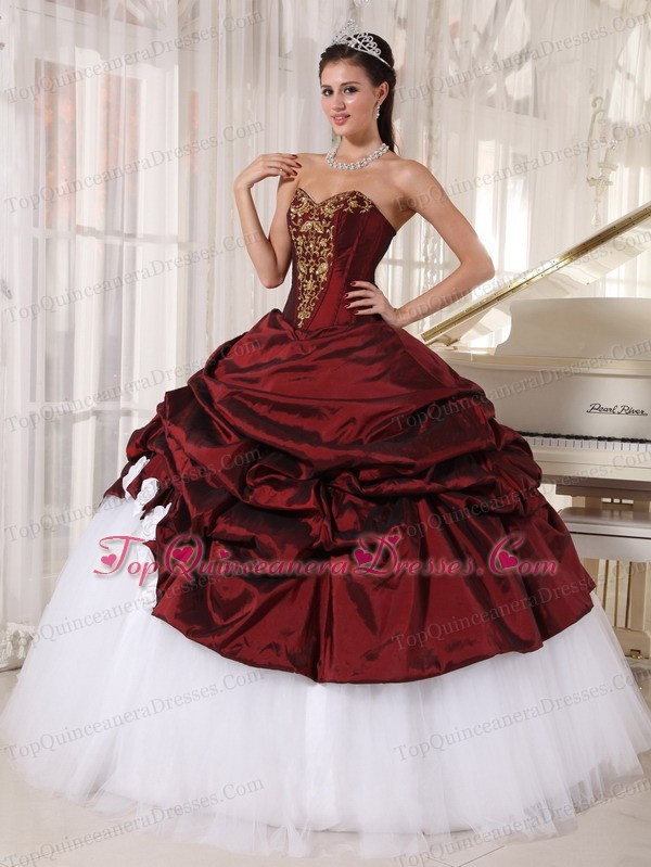 Burgundy And White Quinceanera Dress With Gold Appliques