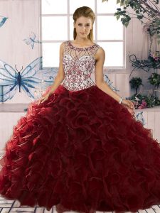 Burgundy Ball Gowns Beading and Ruffles Quinceanera Gowns Lace Up Organza Sleeveless Floor Length
