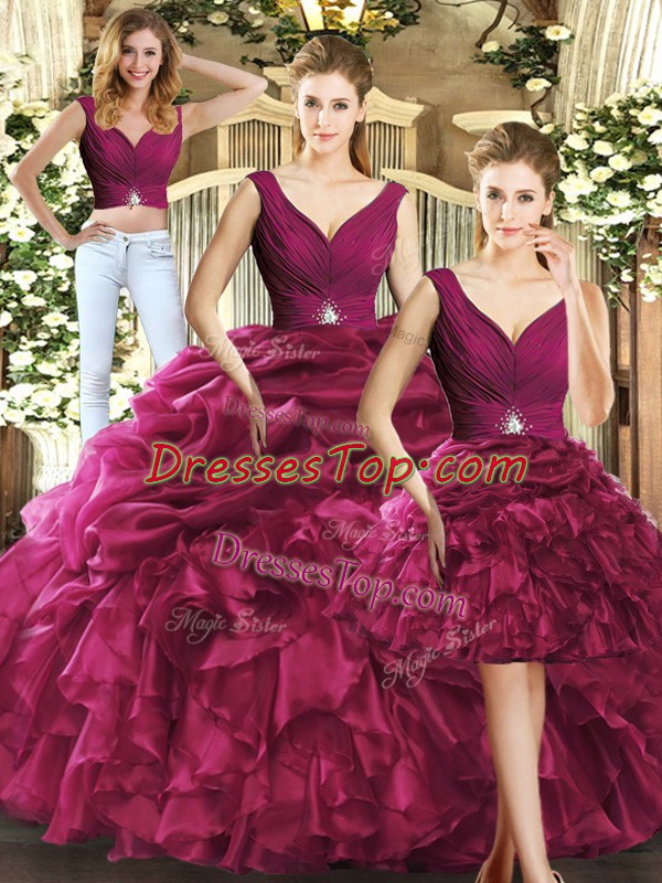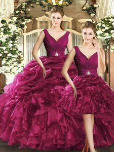 Burgundy Ball Gowns Ruffles and Pick Ups Sweet 16 Quinceanera Dress Backless Organza Sleeveless Floor Length
