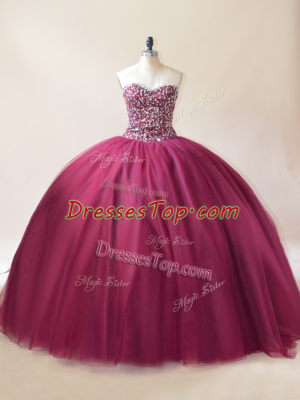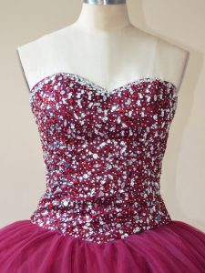 Burgundy Ball Gowns Sweetheart Sleeveless Tulle Floor Length Lace Up Beading Sweet 16 Quinceanera Dress