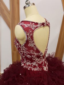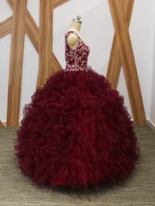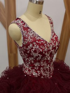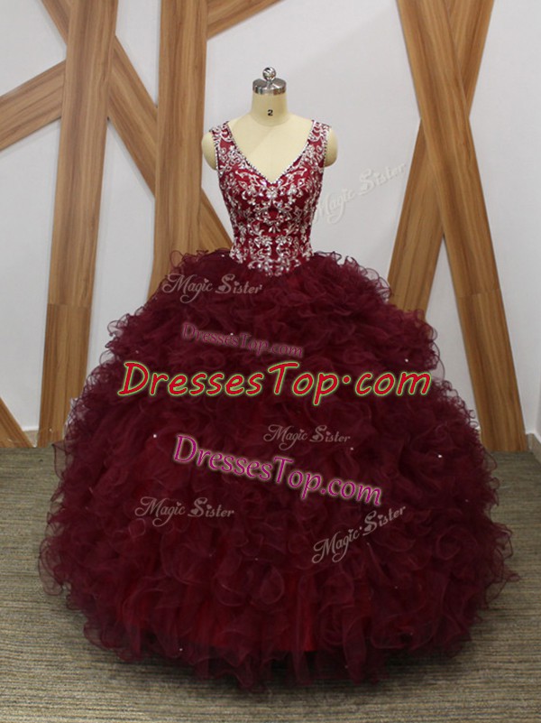Burgundy Ball Gowns V-neck Sleeveless Organza Floor Length Backless Beading and Ruffles Vestidos de Quinceanera