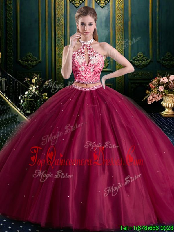 Burgundy Halter Top Lace Up Beading and Lace and Appliques Sweet 16 Dress Sleeveless
