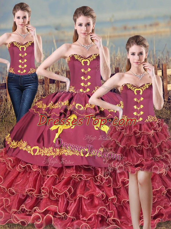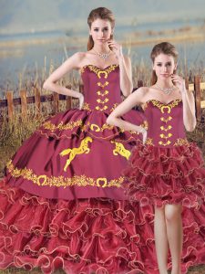 Burgundy Mermaid Satin and Organza Sweetheart Sleeveless Embroidery and Ruffles Lace Up Sweet 16 Quinceanera Dress Brush Train