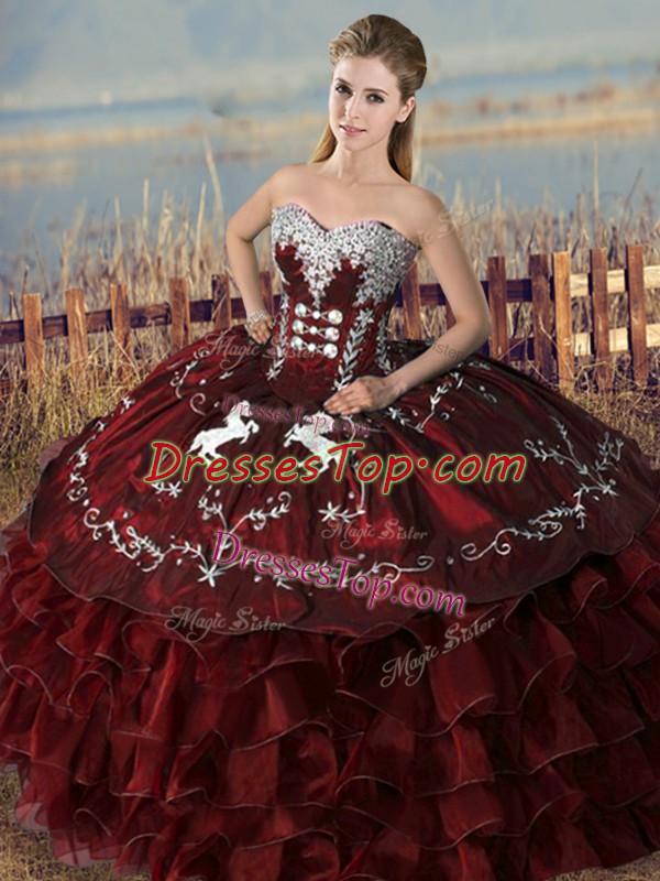 Burgundy Sleeveless Embroidery and Ruffles Floor Length Quinceanera Gown