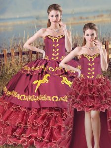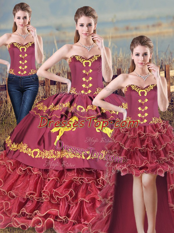 Burgundy Three Pieces Satin and Organza Sweetheart Sleeveless Embroidery and Ruffles Lace Up Quinceanera Dresses Brush Train