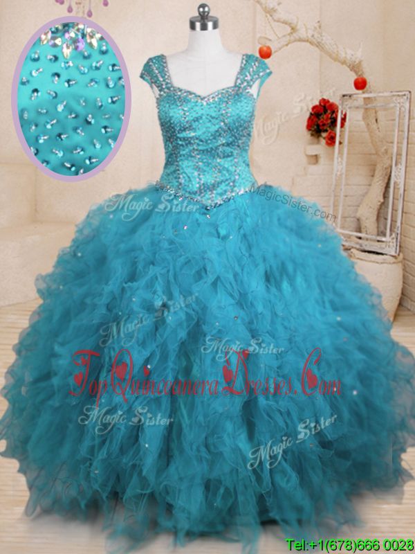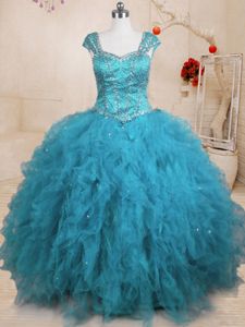 Cap Sleeves Floor Length Beading and Ruffles Lace Up Quinceanera Dress with Baby Blue