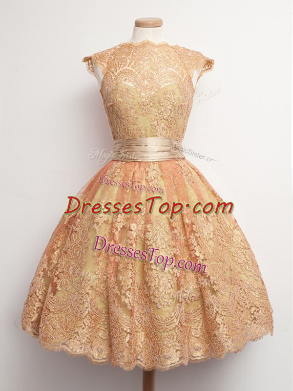 Cap Sleeves Knee Length Belt Lace Up Quinceanera Dama Dress with Gold