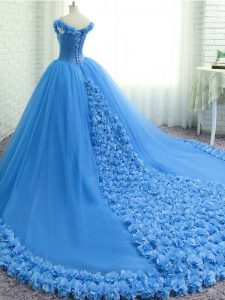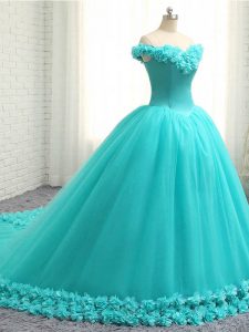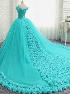 Captivating Aqua Blue Sleeveless Tulle Court Train Lace Up Sweet 16 Quinceanera Dress for Military Ball and Sweet 16 and Quinceanera
