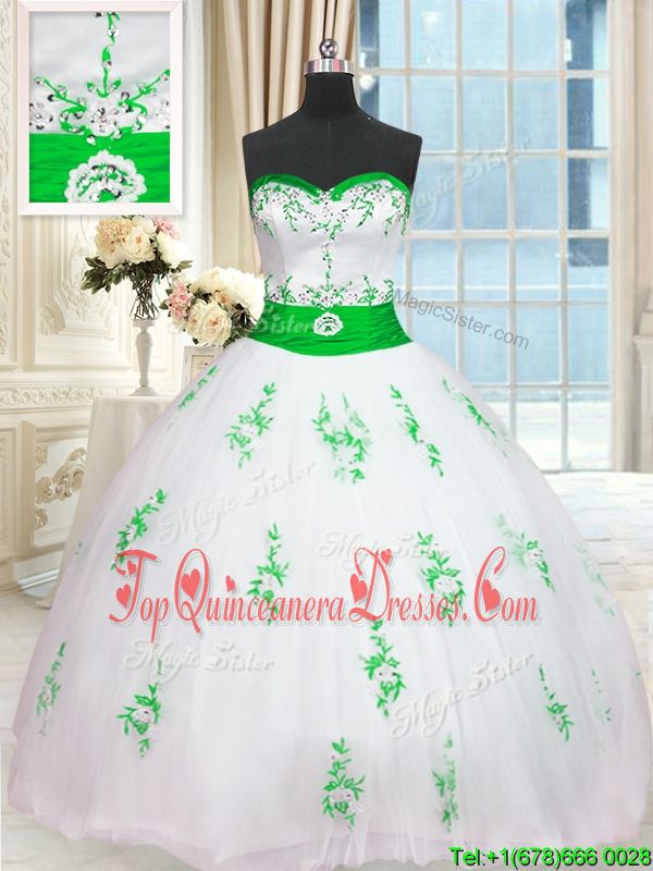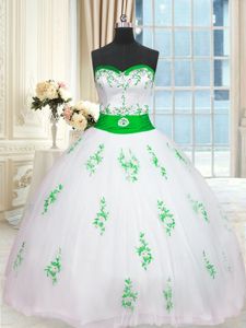Captivating Floor Length Lace Up Ball Gown Prom Dress White and In for Military Ball and Sweet 16 and Quinceanera with Appliques and Belt
