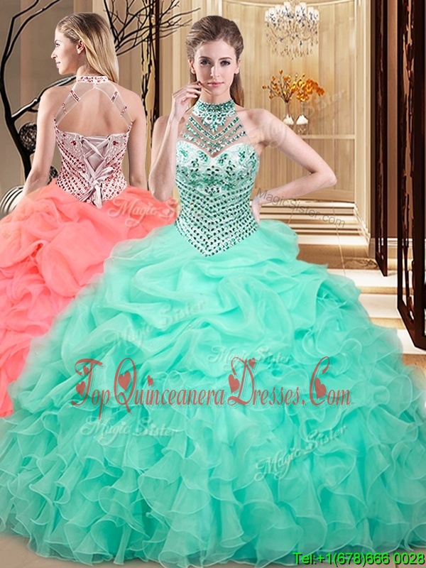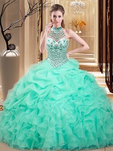 Captivating Halter Top Apple Green Organza Lace Up Quinceanera Dama Dress Sleeveless Floor Length Beading and Ruffles and Pick Ups