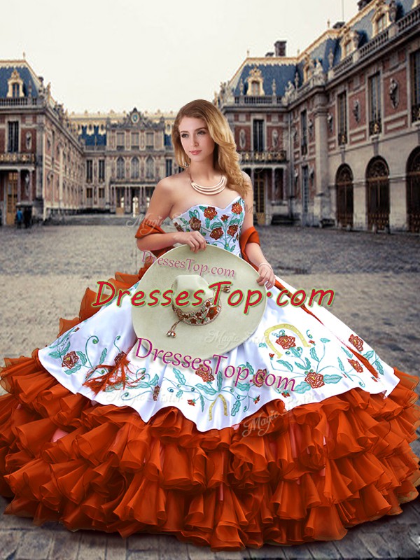 Captivating Rust Red Sweetheart Lace Up Embroidery and Ruffled Layers Quinceanera Gown Sleeveless