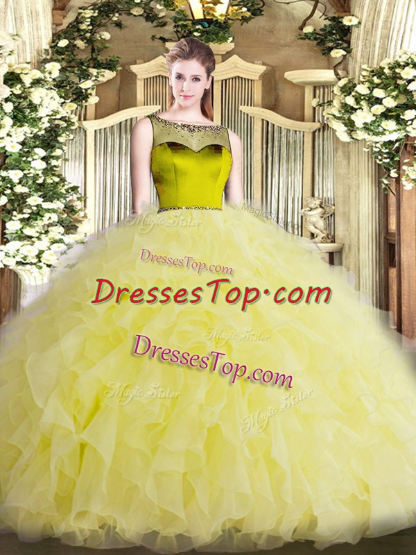 Captivating Scoop Sleeveless Sweet 16 Dresses Floor Length Beading and Ruffles Yellow Organza