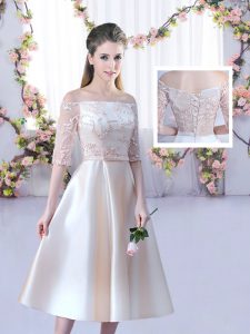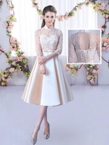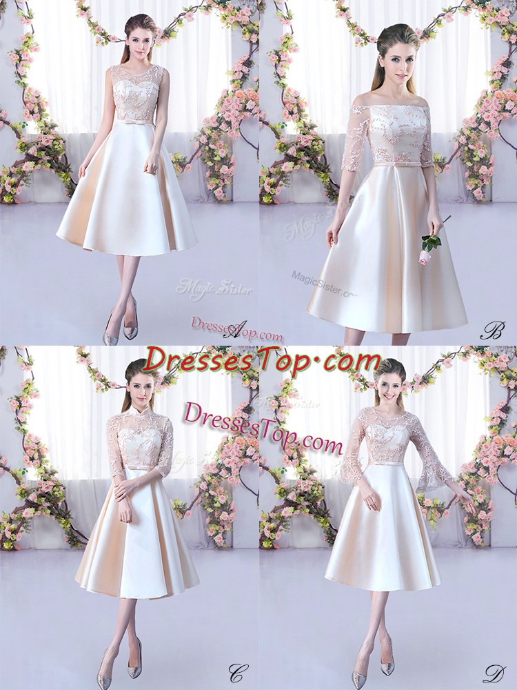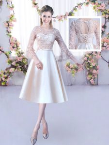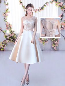 Champagne A-line Satin Scoop Sleeveless Lace and Belt Tea Length Lace Up Court Dresses for Sweet 16