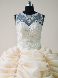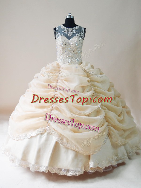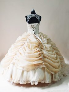 Champagne Ball Gowns Lace and Appliques Sweet 16 Dresses Lace Up Organza Sleeveless Floor Length