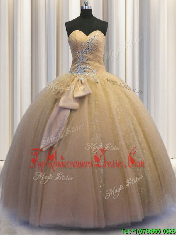 Champagne Ball Gowns Tulle and Sequined Sweetheart Sleeveless Beading and Bowknot Floor Length Lace Up Sweet 16 Dresses