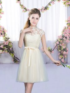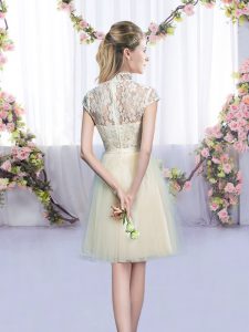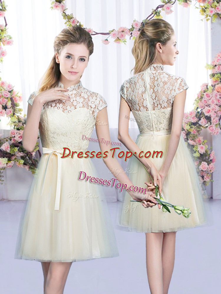 Champagne Cap Sleeves Mini Length Lace and Bowknot Lace Up Vestidos de Damas