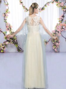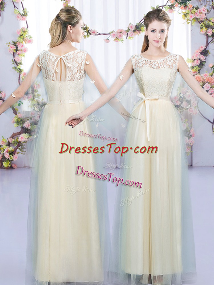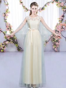 Champagne Empire Scoop Sleeveless Tulle Floor Length Lace Up Lace and Bowknot Quinceanera Court Dresses