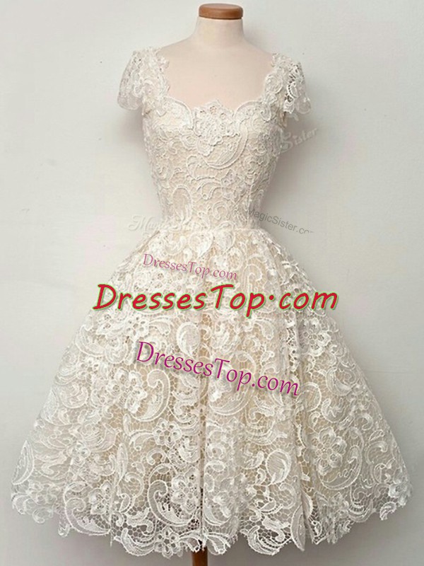 Champagne Straps Neckline Lace Quinceanera Court of Honor Dress Cap Sleeves Lace Up