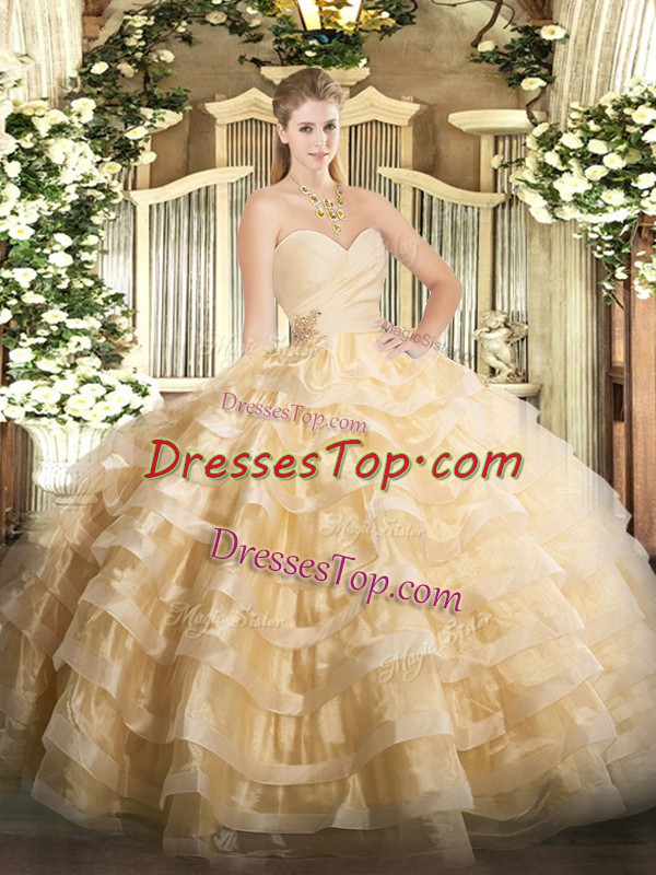Champagne Sweet 16 Dress Military Ball and Sweet 16 and Quinceanera with Beading and Ruffled Layers Sweetheart Sleeveless Lace Up