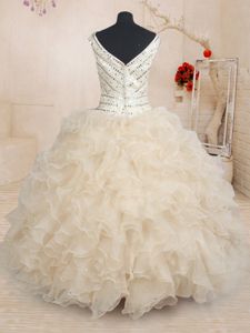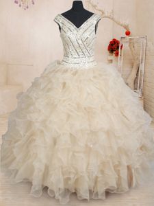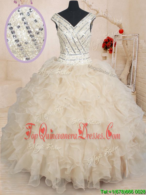 Champagne Zipper Quinceanera Dresses Beading and Ruffles and Sequins Cap Sleeves Floor Length