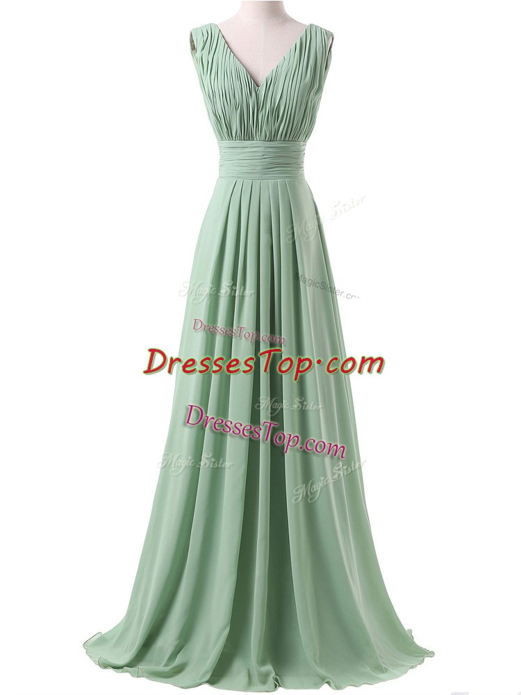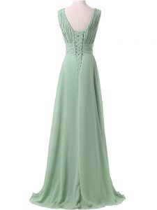 Charming Apple Green Chiffon Lace Up V-neck Sleeveless Floor Length Dama Dress for Quinceanera Ruching